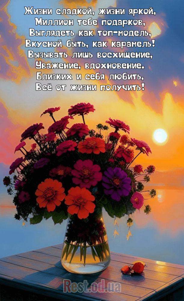 "Ты словно солнце, которое озаряет этот мир своим теплом, светом и добротой. Пусть твоя энергия никогда не иссякает, а жизненный путь будет светлым и радостным. Оставайся собой, ведь ты – настоящая драгоценность!"